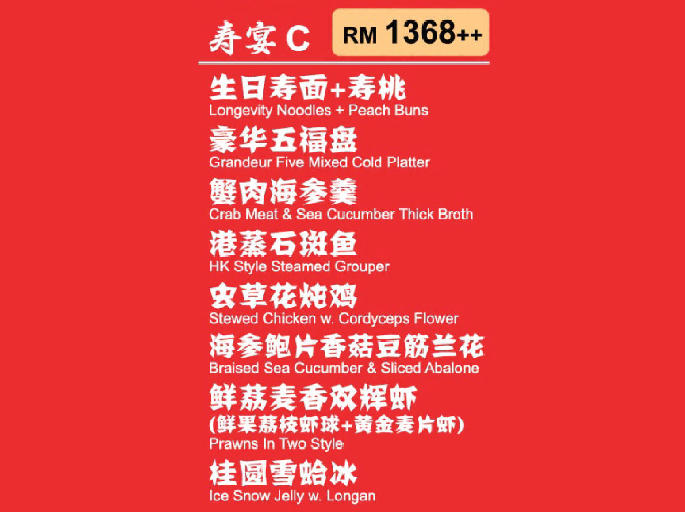 1. 寿宴配套只供 10 位享用 (For 10 pax only)